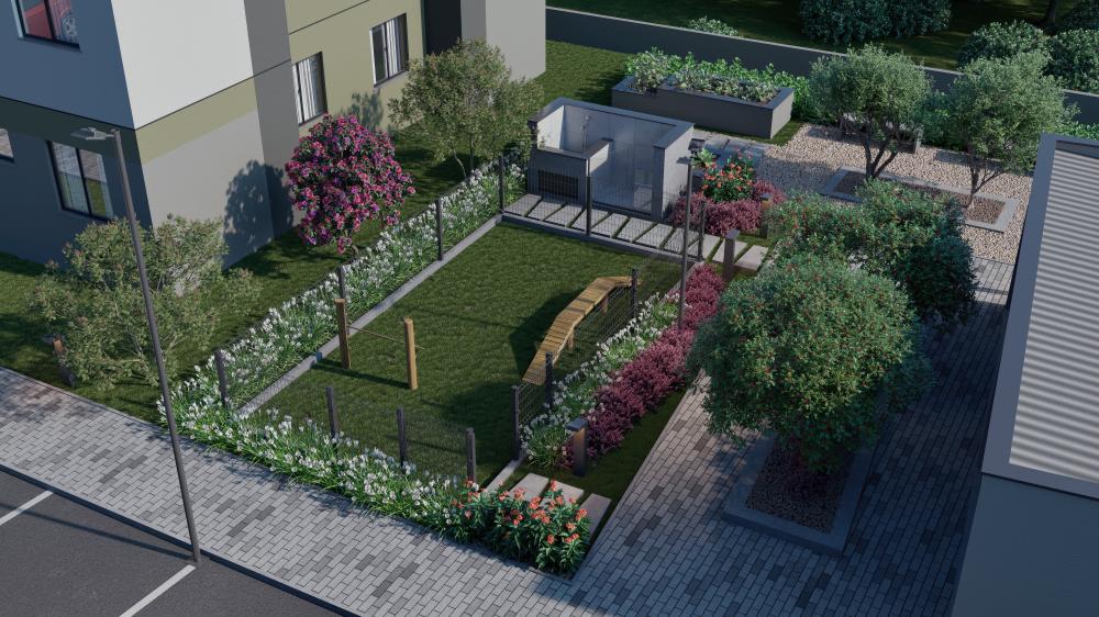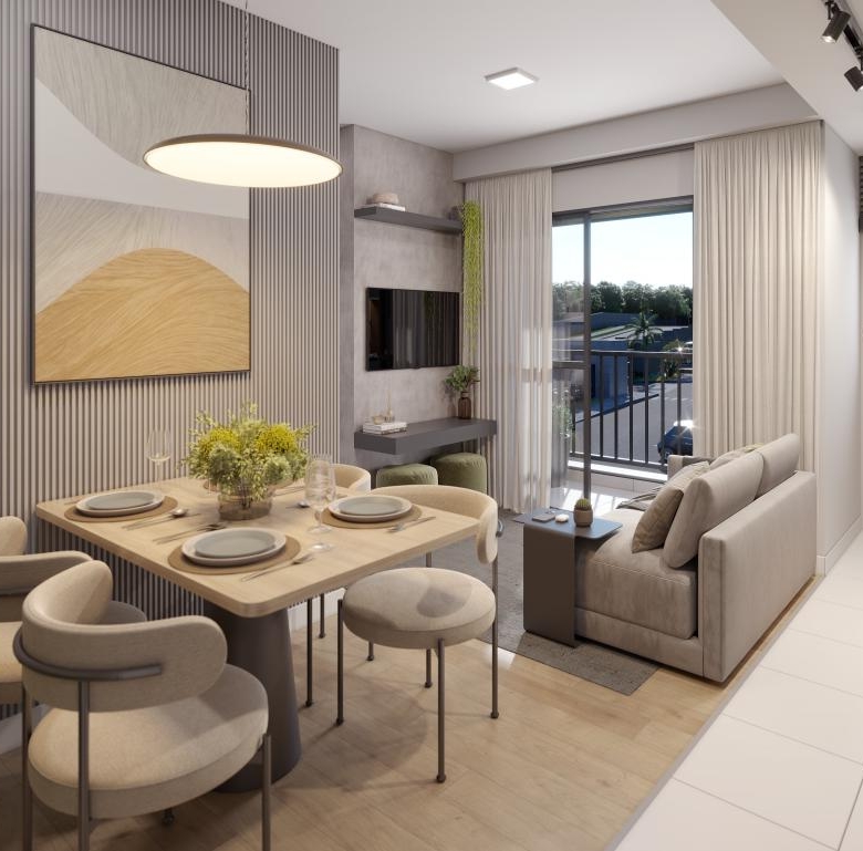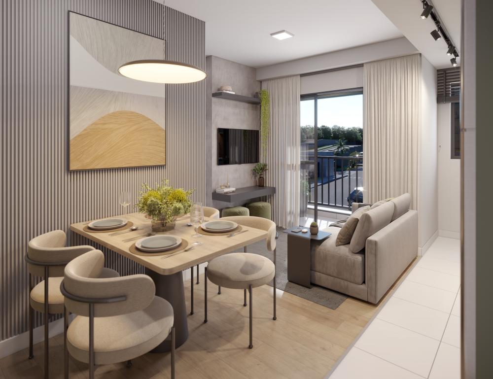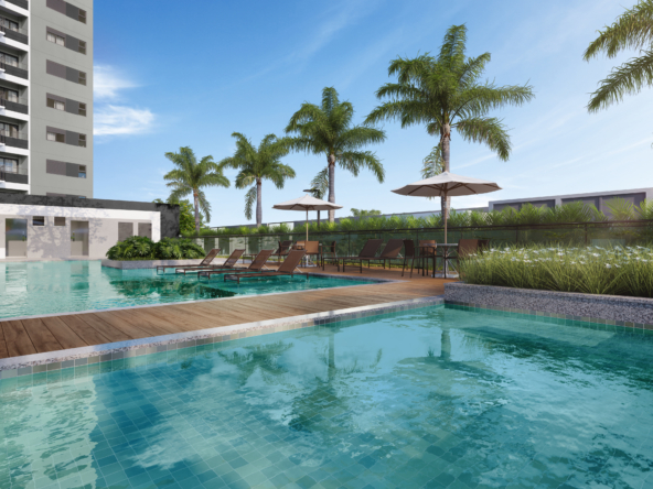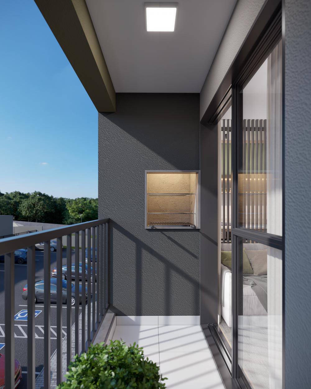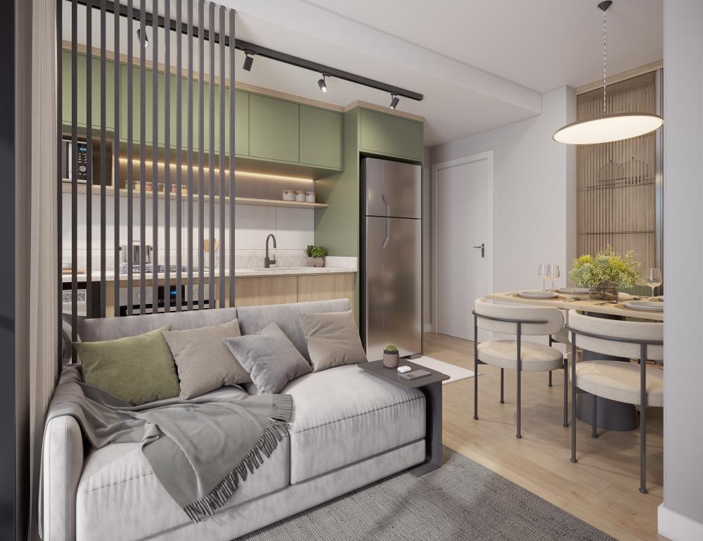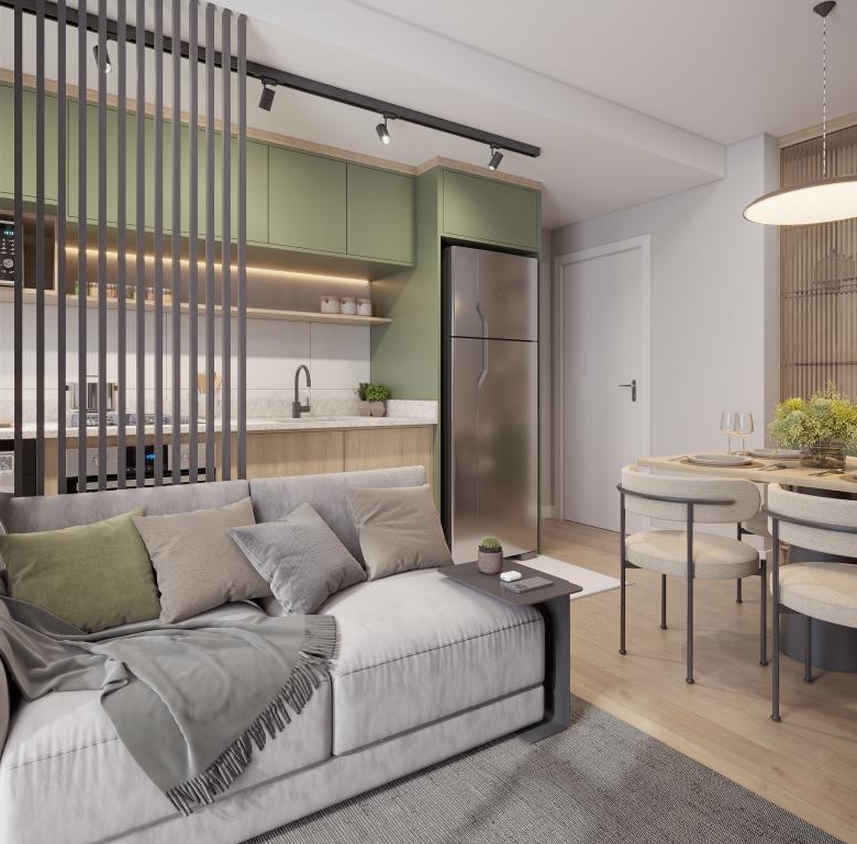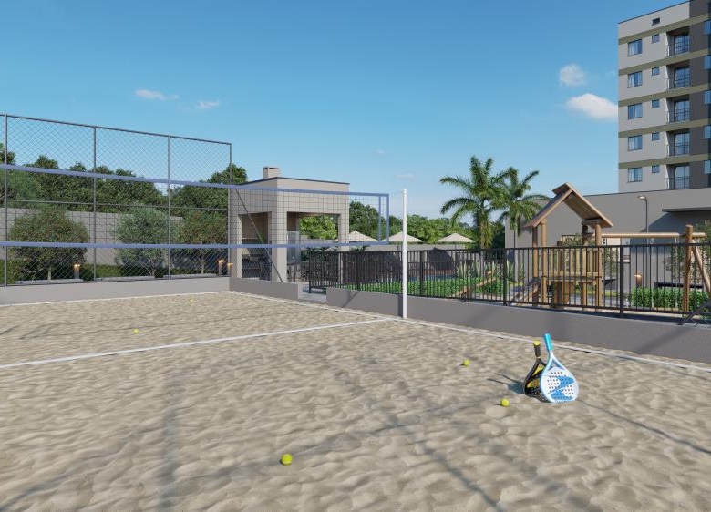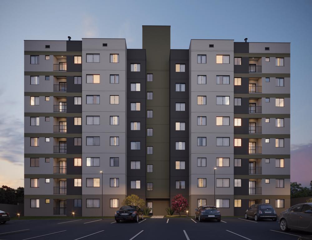 • Apartamentos de 43 m² com 2 dormitórios e 1 banheiro.