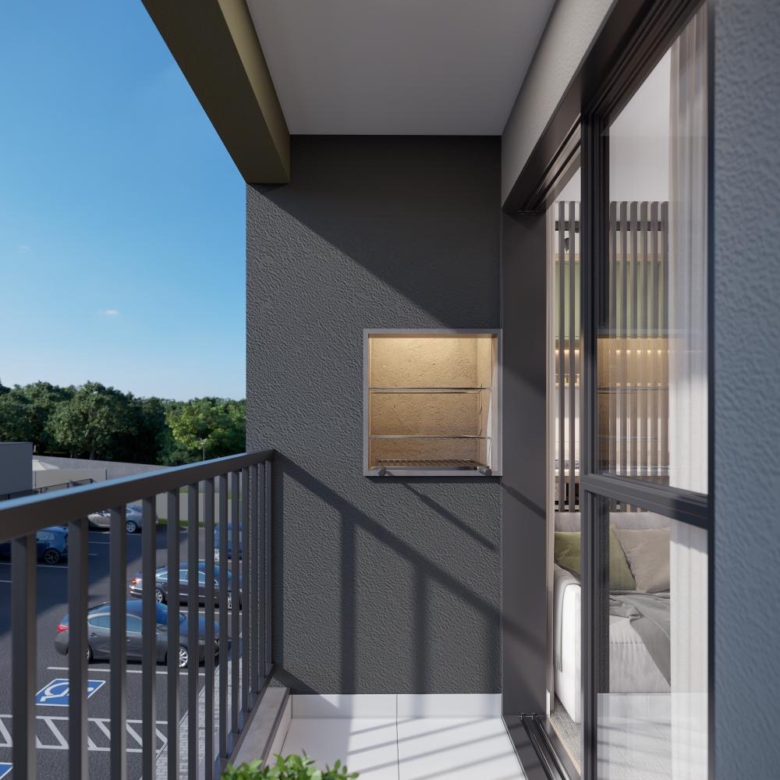 • Sacada com churrasqueira a carvão em algumas unidades;