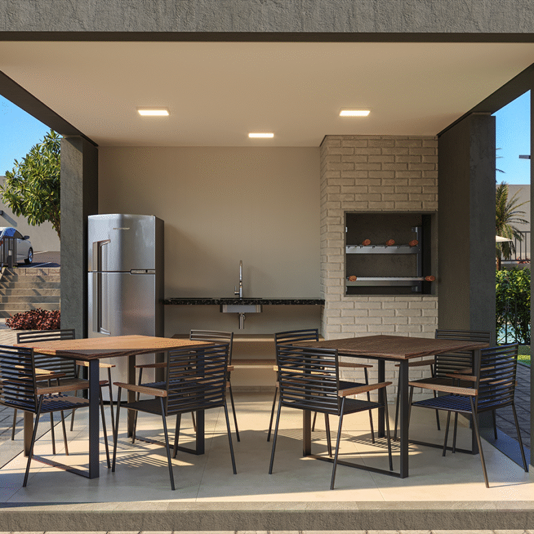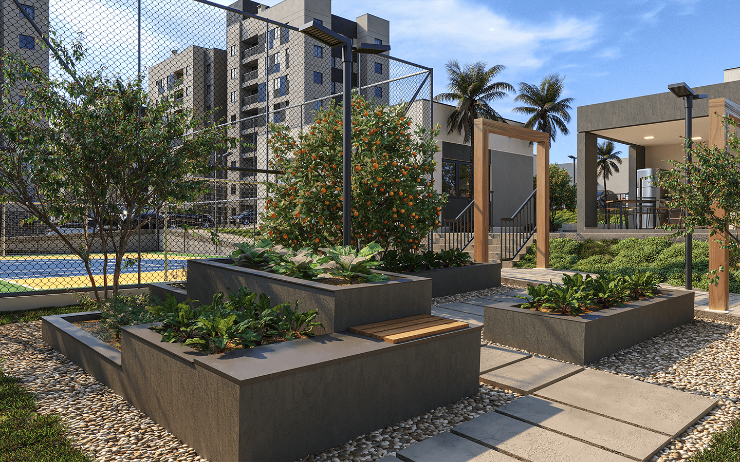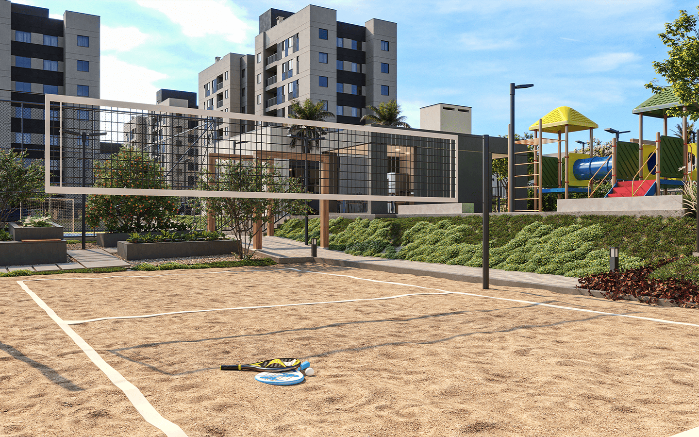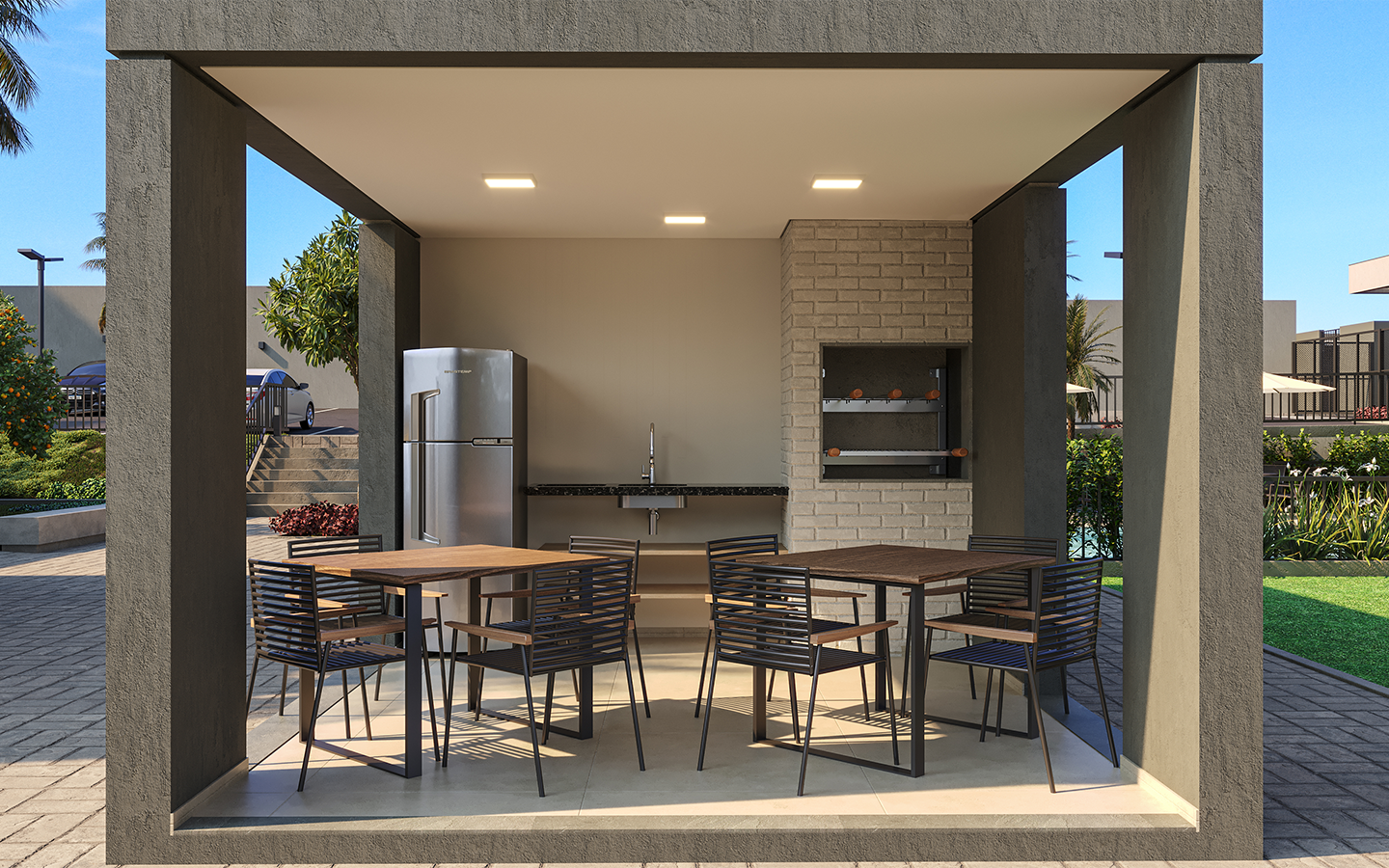• Apartamentos de aproximadamente 50 m² com 2 quartos, 1 banheiro e sacada com churrasqueira em algumas unidades