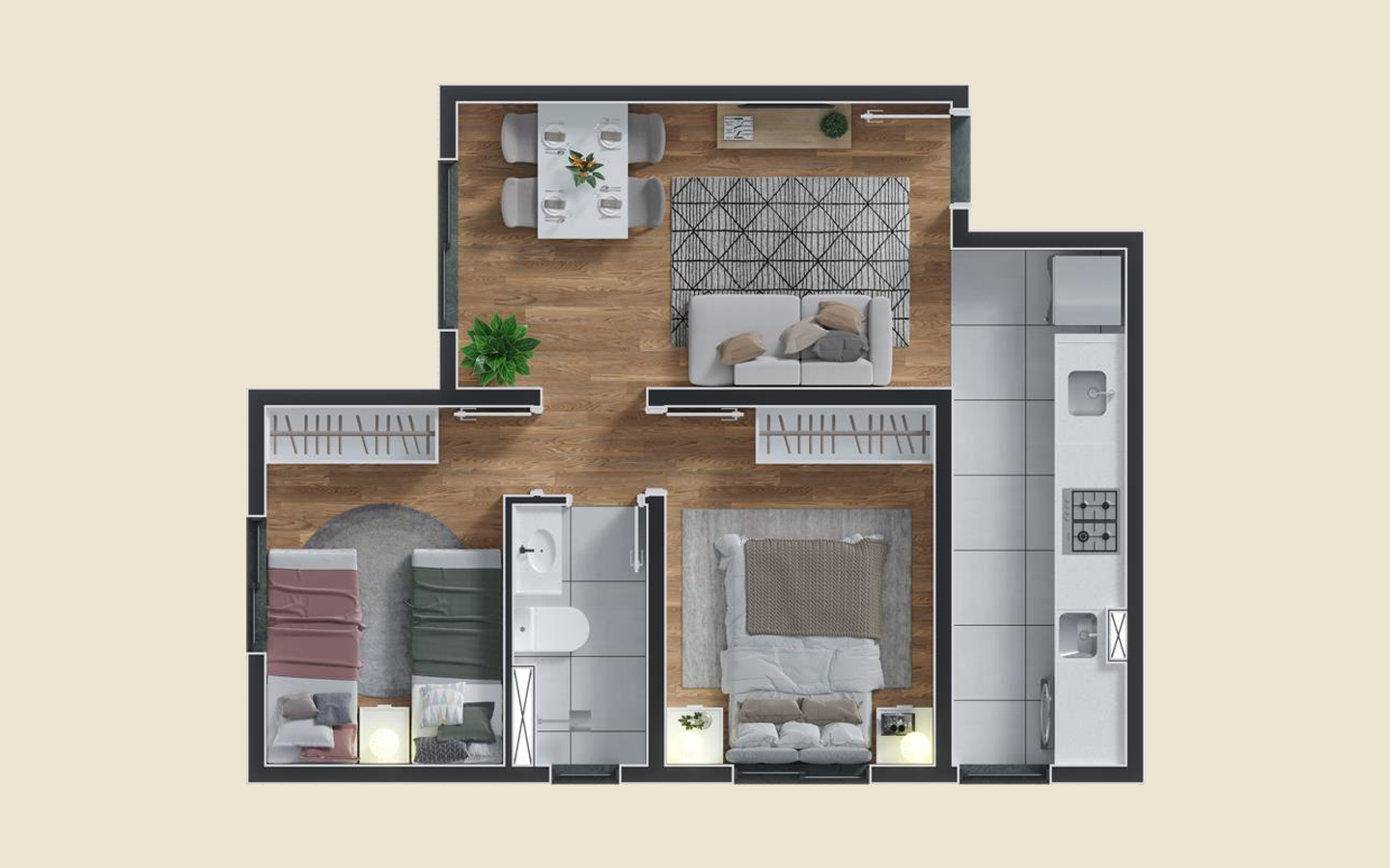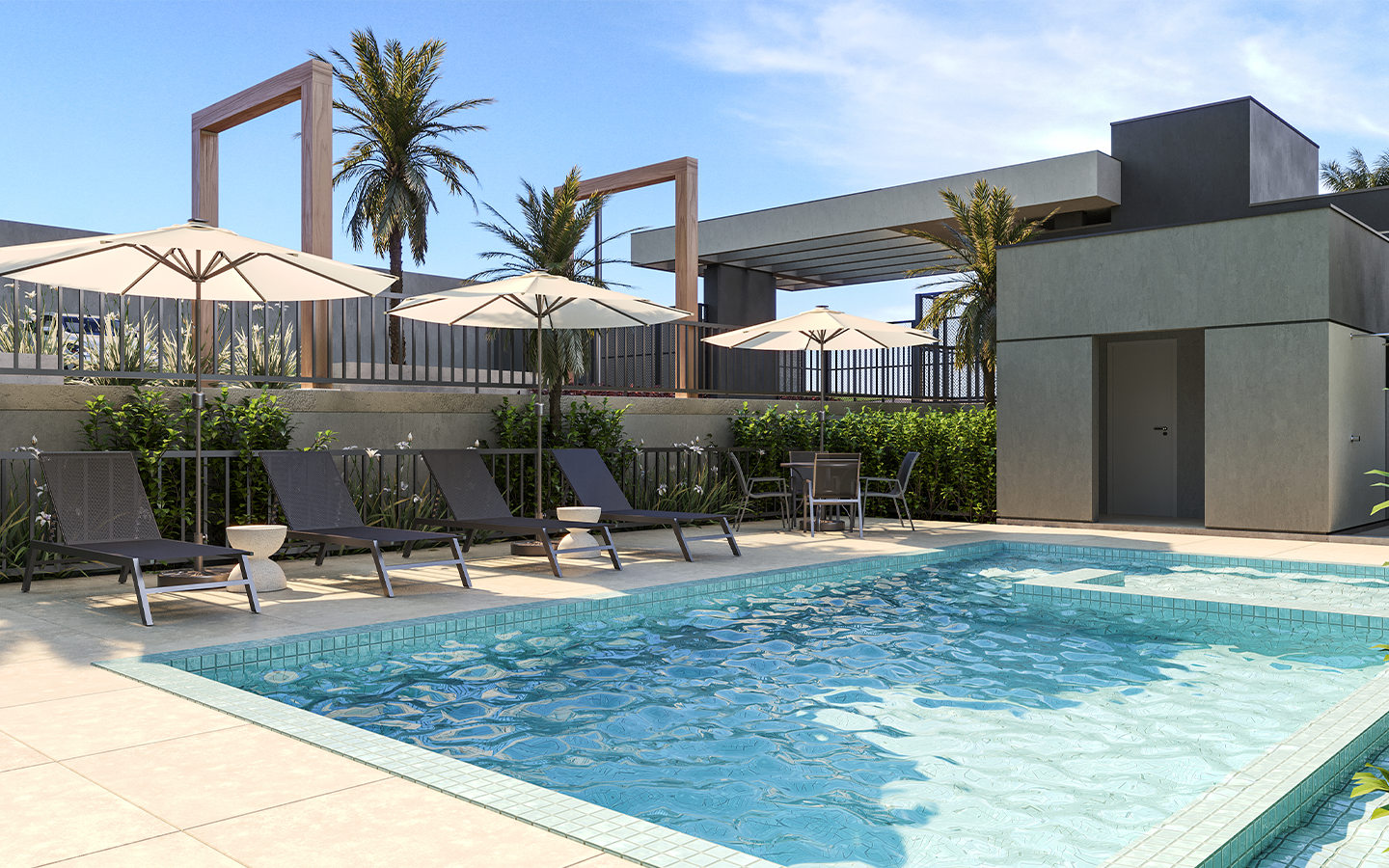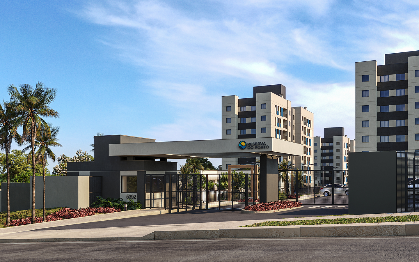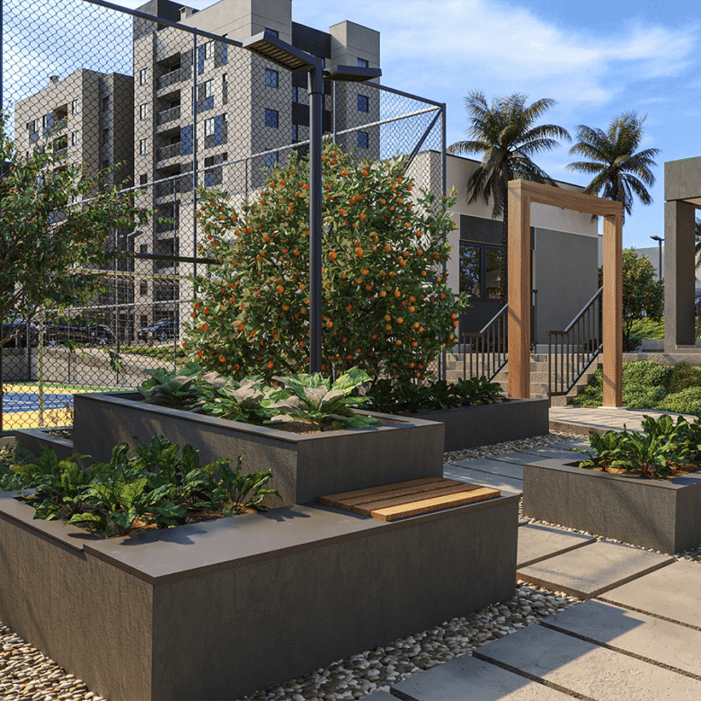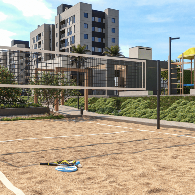• Apartamentos de aproximadamente 50 m² com 2 quartos, 1 banheiro e sacada com churrasqueira em algumas unidades