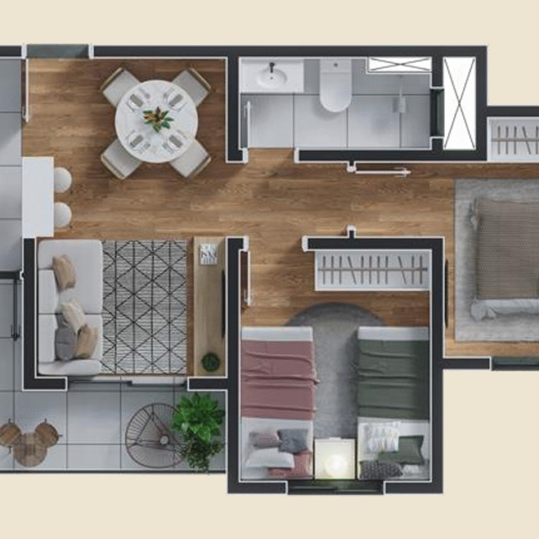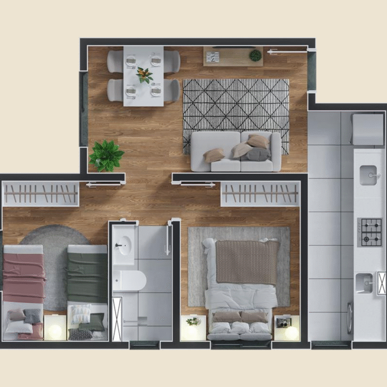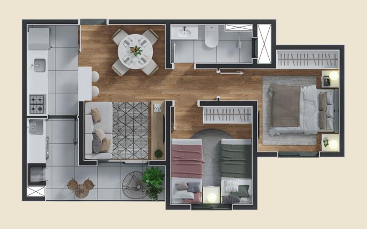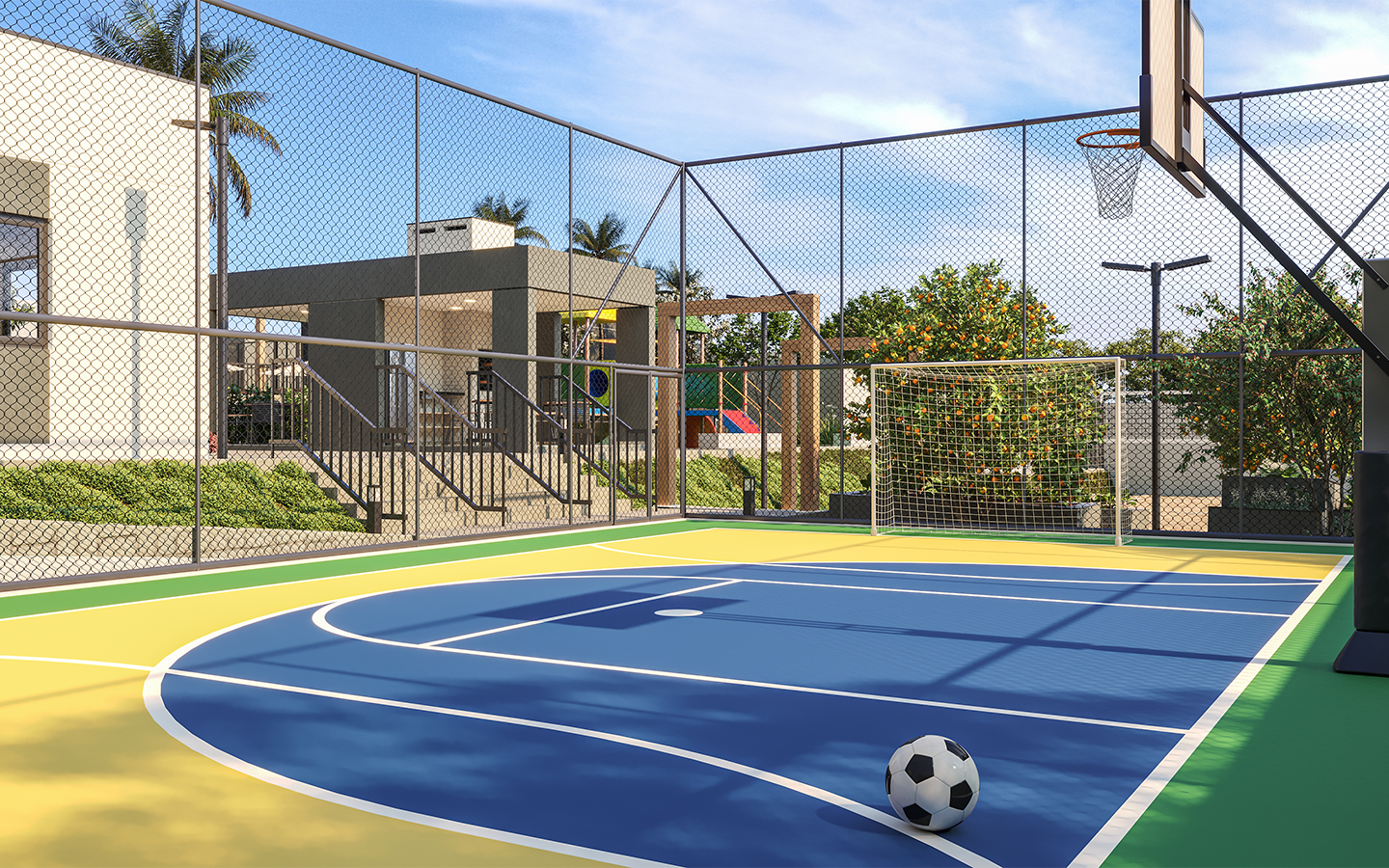 • Apartamentos de aproximadamente 50 m² com 2 quartos, 1 banheiro e sacada com churrasqueira em algumas unidades